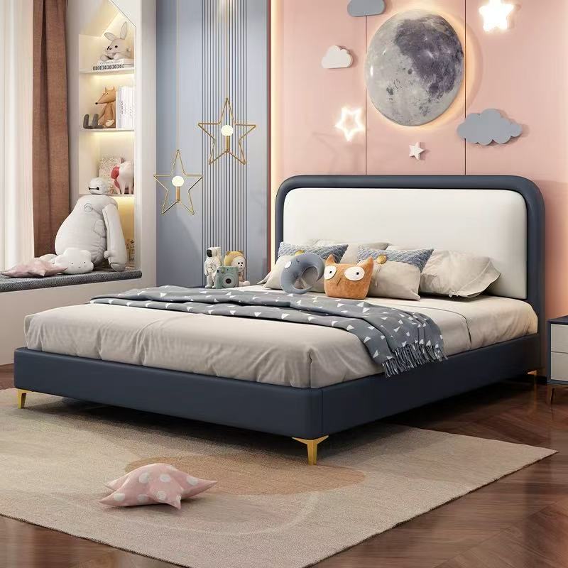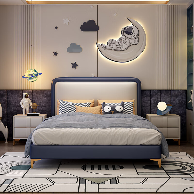 Astronaut theme solid wood kids bed with soft upholstery, customizable size & color