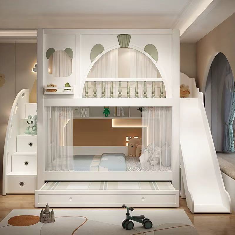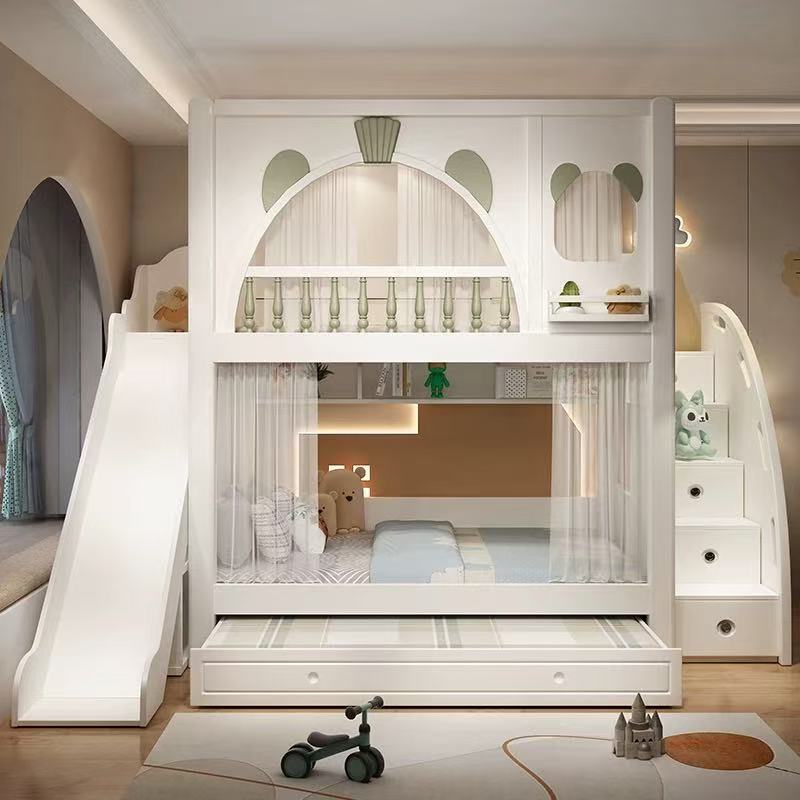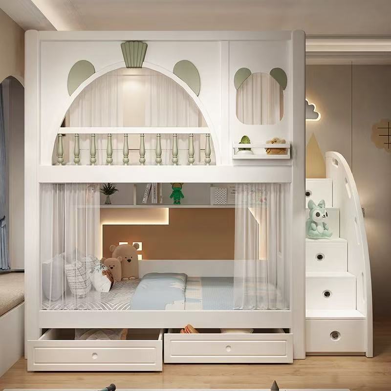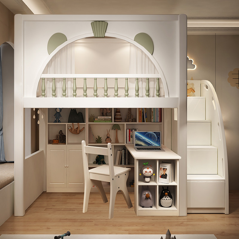 🪜 Curved Staircase with Storage:Smooth curved staircase ensures safe and easy access to the loft bed, with built-in storage compartments for toys, books and daily necessities