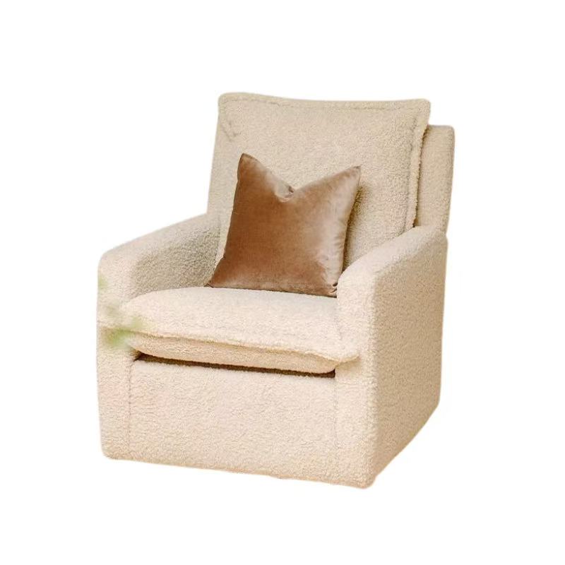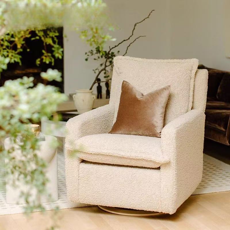 This single recliner chair features a soft beige sherpa upholstery, paired with a rich copper accent pillow for a touch of warmth and contrast. The seat and backrest are filled with high-density sponge for long-lasting resilience, while the reinforced metal frame ensures stability and durability.