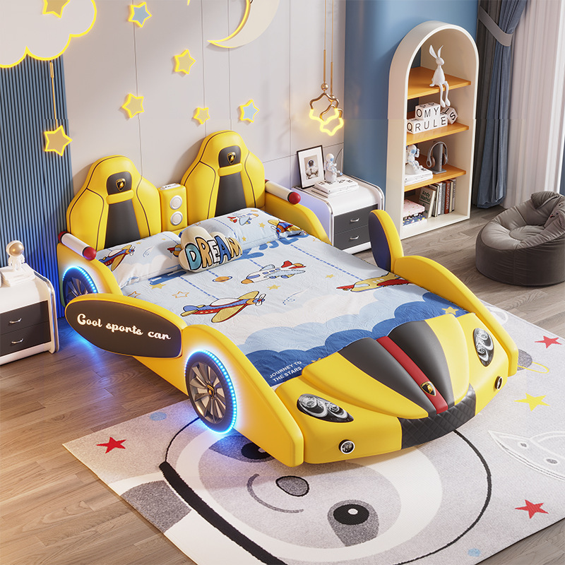 Car-Shaped Solid Wood Single Bed with Guardrail Storage Leather Sports Car Bed