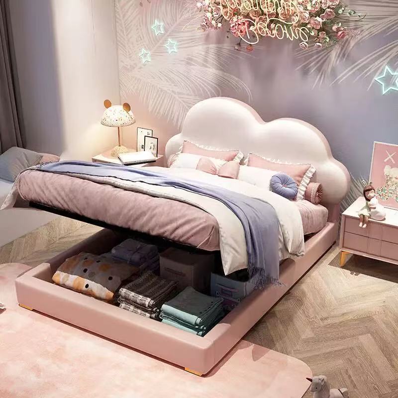 Cloud-shaped Dreamy Princess Kids Bed Pink Upholstered Solid Wood Bed for Girls