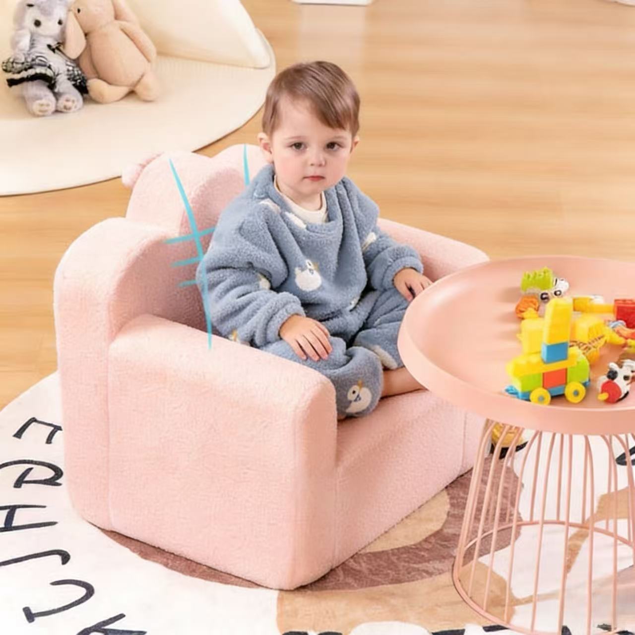 Compact armchair design with curved armrests and a supportive backrest fits toddlers’ body proportions, ensuring comfortable sitting for hours.