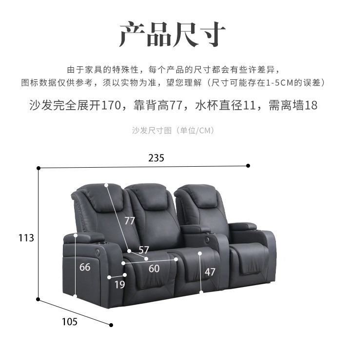 Measuring 235×105×113cm, this sofa comfortably accommodates three people while maintaining a compact footprint that fits seamlessly into living rooms, home theaters, or small to medium-sized spaces.