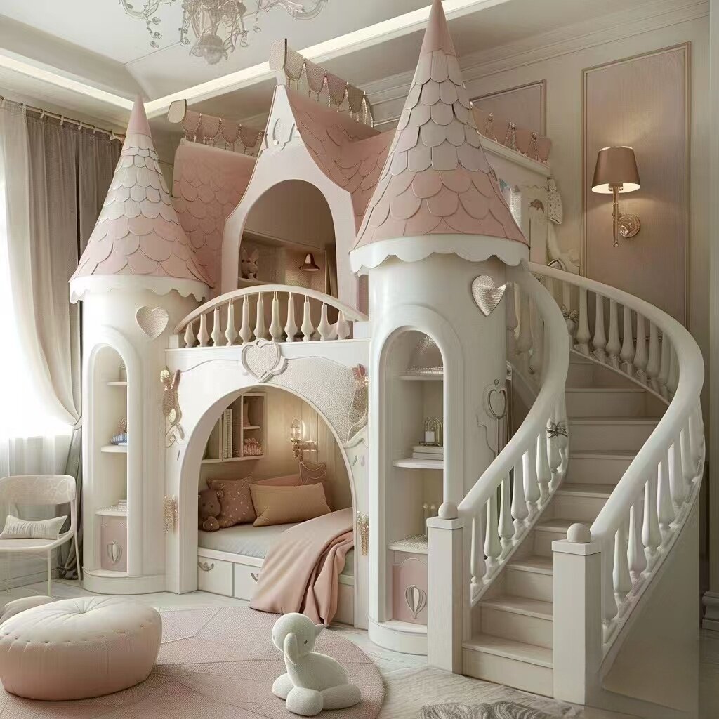 🌀 Spiral staircase design adds elegance to the kids’ room