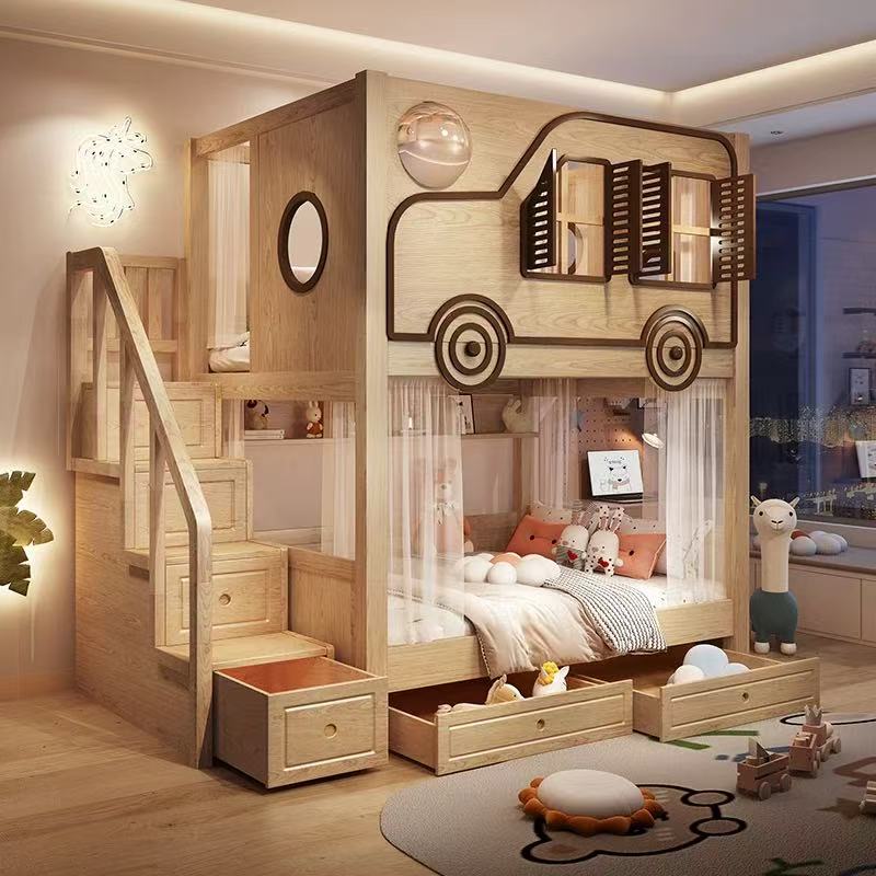 All edges and corners are rounded and polished to prevent bumps and scratches. The soft fabric curtains around the bed create a cozy nook for sleeping or reading, making it a favorite spot for kids to relax and play.