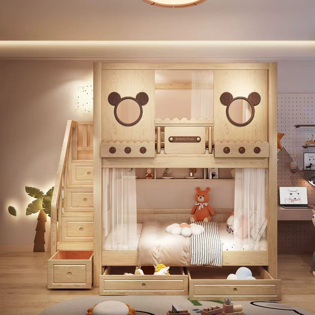 This kids loft bed features a beloved Mickey Mouse ear motif on the cabinet doors, blending playful cartoon elements with practical storage and a staircase to create a magical sleep and play zone for children. Crafted from premium solid wood, it offers natural durability, eco-friendly materials and no harmful odors, ensuring a safe and sturdy piece of furniture for kids’ bedrooms.