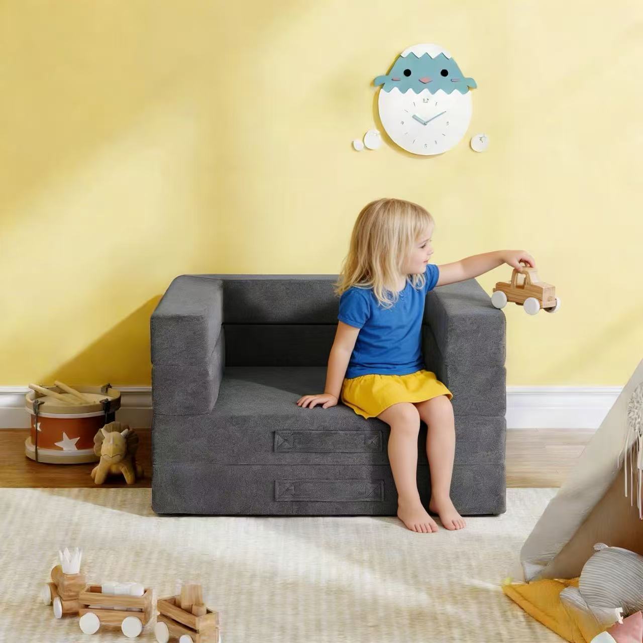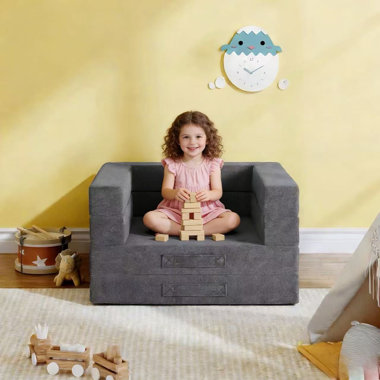 Unique foldable structure with double layer construction allows the sofa to adjust height and size, adapting to kids’ growing needs and saving space when not in use.