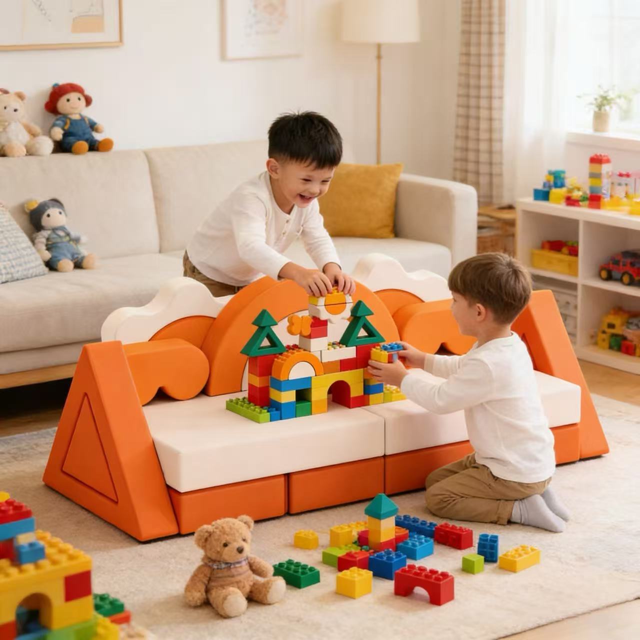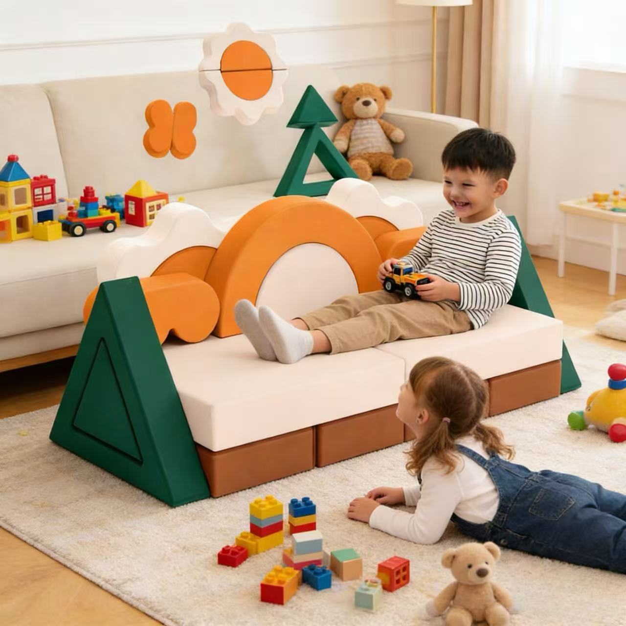 Features rainbow arches, triangular blocks and rectangular cushions—kids can assemble into sofa, fort, playhouse or climbing structure to boost creativity.