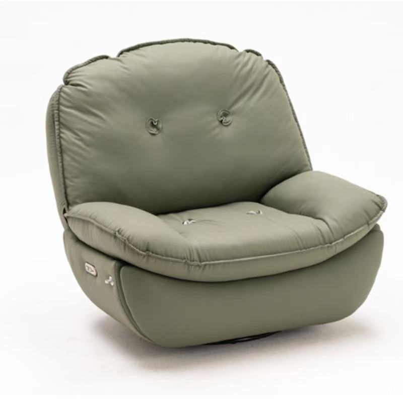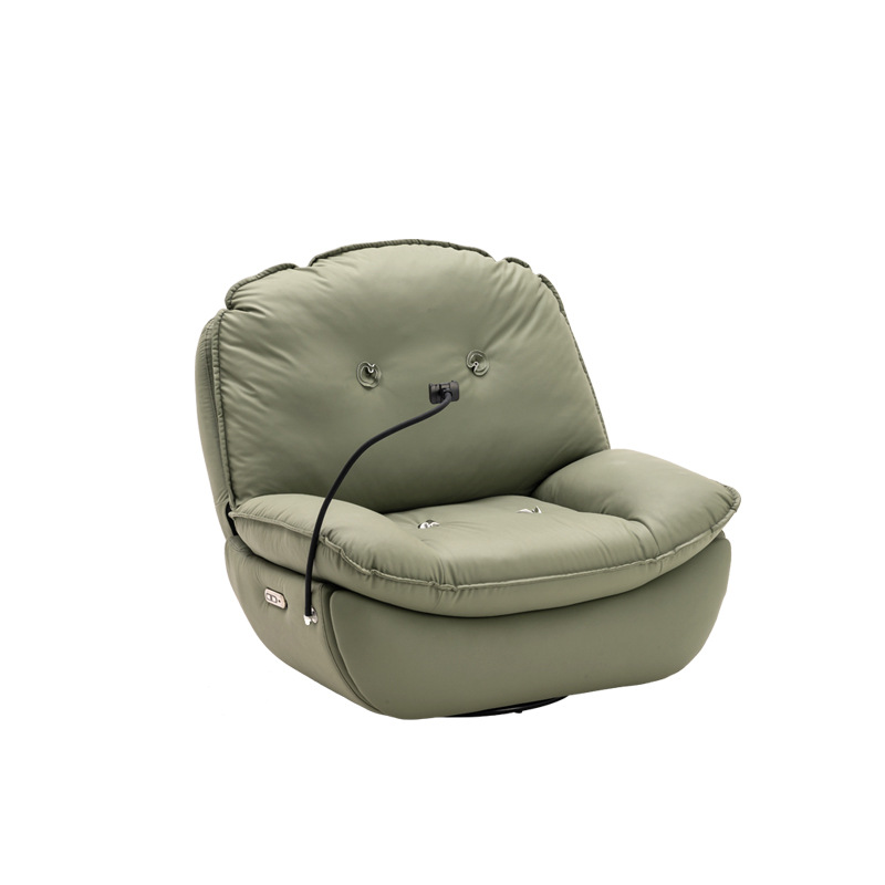 This single electric recliner sofa features a luxurious sage green leather upholstery, with a deeply padded, rounded design that wraps you in plush support. The seat and backrest are filled with high-density sponge for long-lasting resilience, while the reinforced metal frame ensures stability and durability.