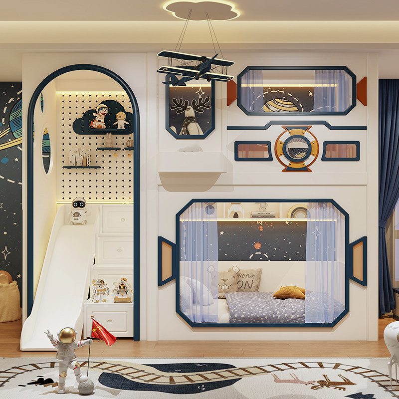 🚀 Space Exploration Rocket Design:Sleek white with navy blue and orange accents, rocket-shaped paneling, space porthole decor and astronaut-themed ornaments create a realistic interstellar exploration atmosphere for kids’ bedrooms, perfect for young space adventurers