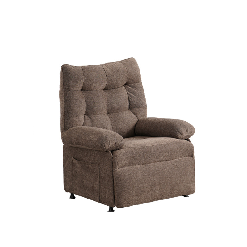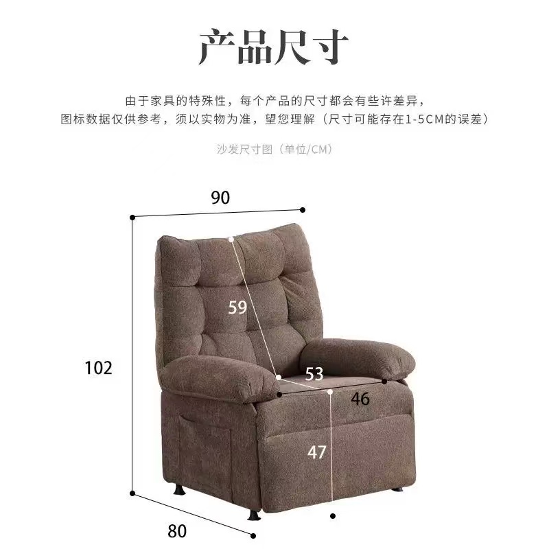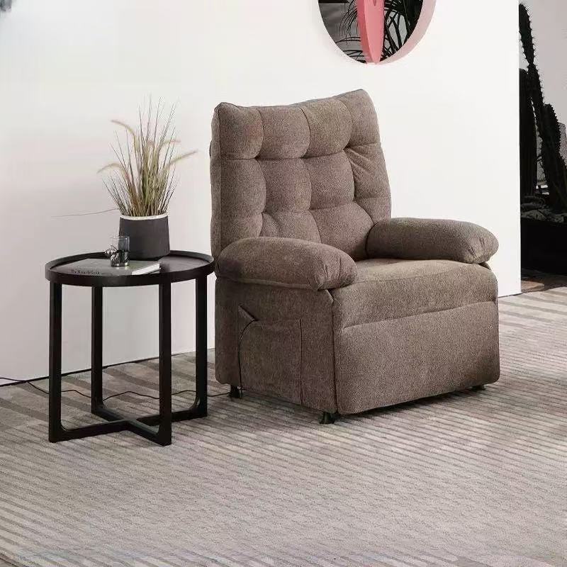 This single recliner chair features a soft taupe cotton fabric upholstery, with a deeply padded, tufted design that offers cloud-like support. The seat and backrest are filled with high-density sponge for long-lasting resilience, while the reinforced metal frame ensures stability and durability.