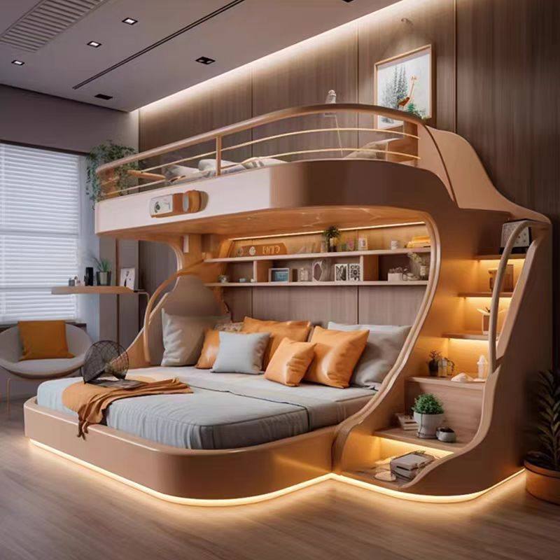 A modern tech-style solid wood kids loft bed, the streamlined capsule design is full of a sense of future, the combination of walnut wood and metal highlights the light luxury style, built-in multi-layer storage and leisure areas, supporting full house custom layout, a fashionable and innovative furniture choice for older kids’ rooms.
