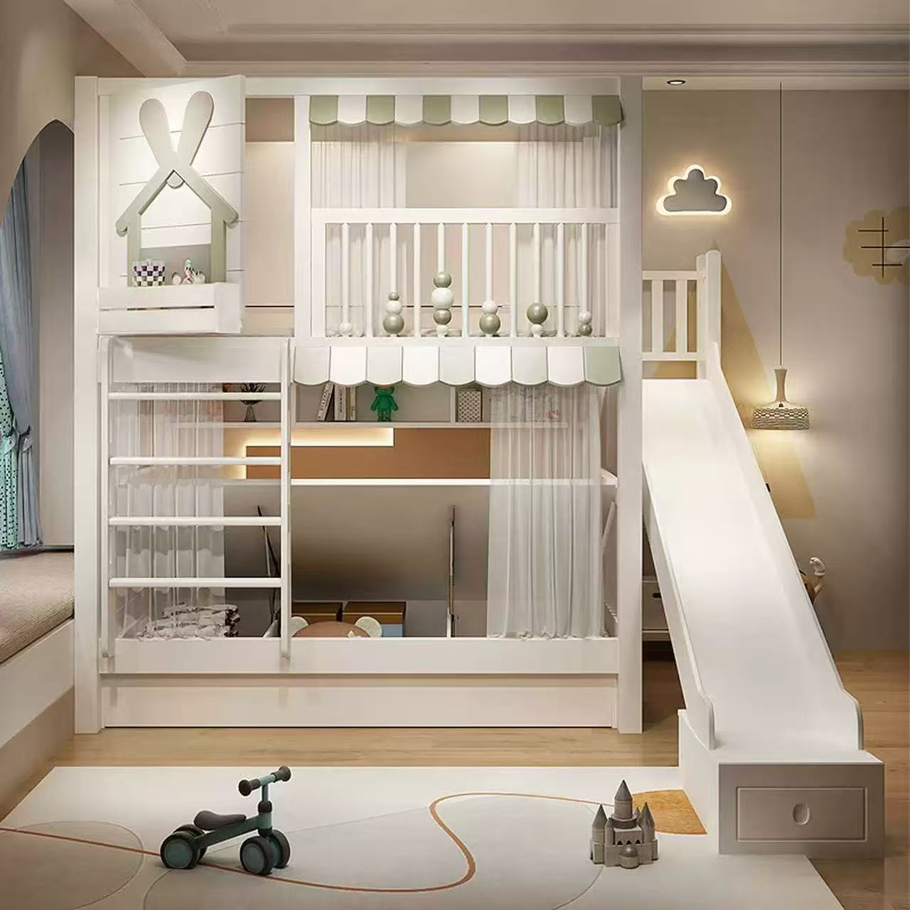 This white & light green rabbit-house bunk bed blends soft tones with playful functionality: